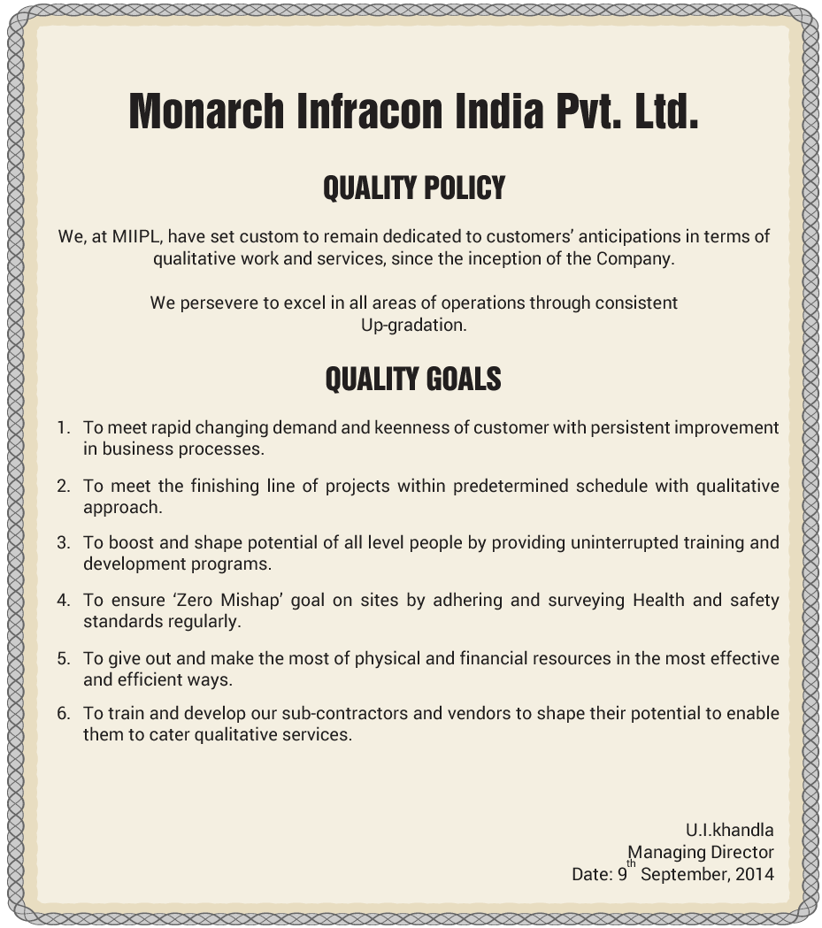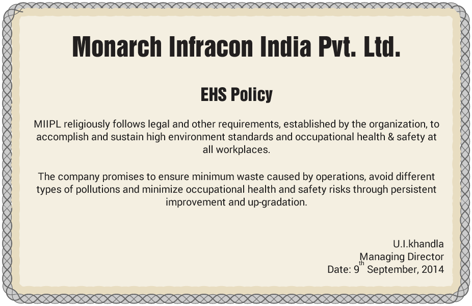 The very foundation of MIIPL is 'quality' construction hence we have been able to have ISO 9001certification and other certification like